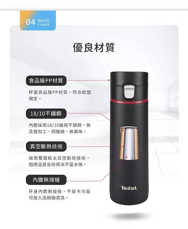 Tefal法國特福wego彈蓋不鏽鋼保溫杯 保溫瓶430ml 沉靜黑 蝦皮購物